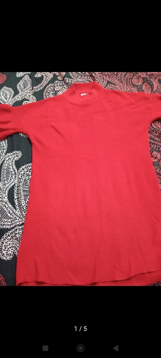 Kırmızı, bisiklet yaka, uzun kollu ve vücuda oturan kadın triko sweatshirt. Yumuşak sentetik kumaştan, günlük rahat giyim için uygundur.