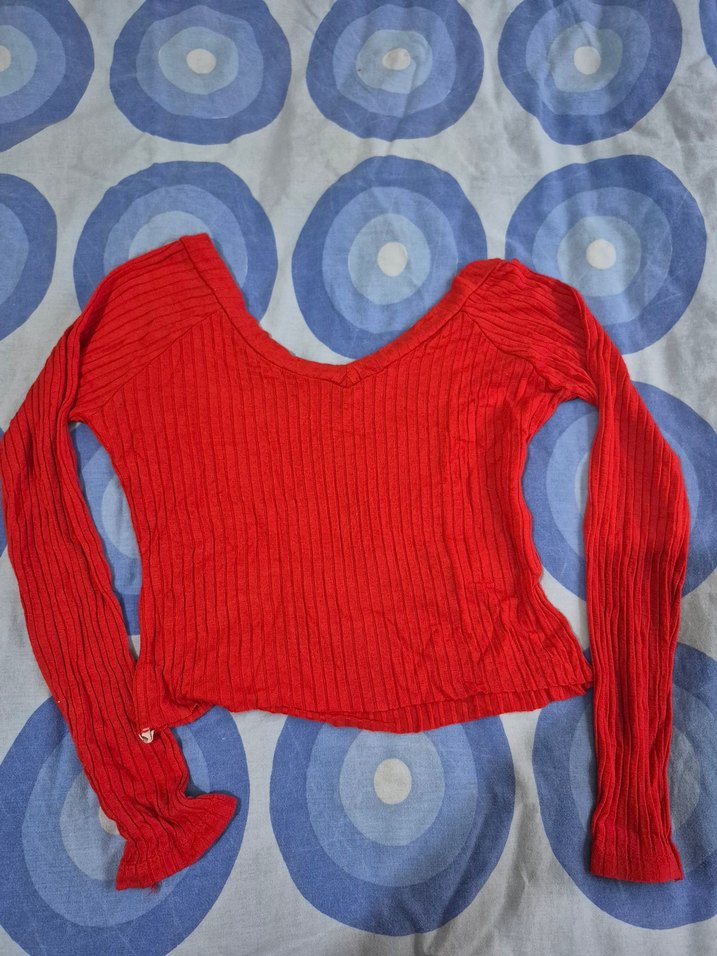 Dar kesim, uzun kollu ve kayık yaka kırmızı kadın triko bluz. Yumuşak sentetik kumaştan örülmüş, günlük rahat sokak stili için uygun.