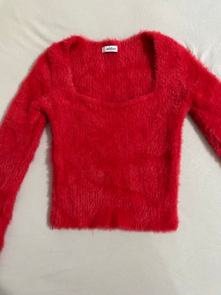 Kırmızı, uzun kollu , tekne yaka, vücuda oturan kesime sahip, yumuşak ve sıcak dokulu örme kumaştan yapılmış günlük kullanıma uygun triko kazak.