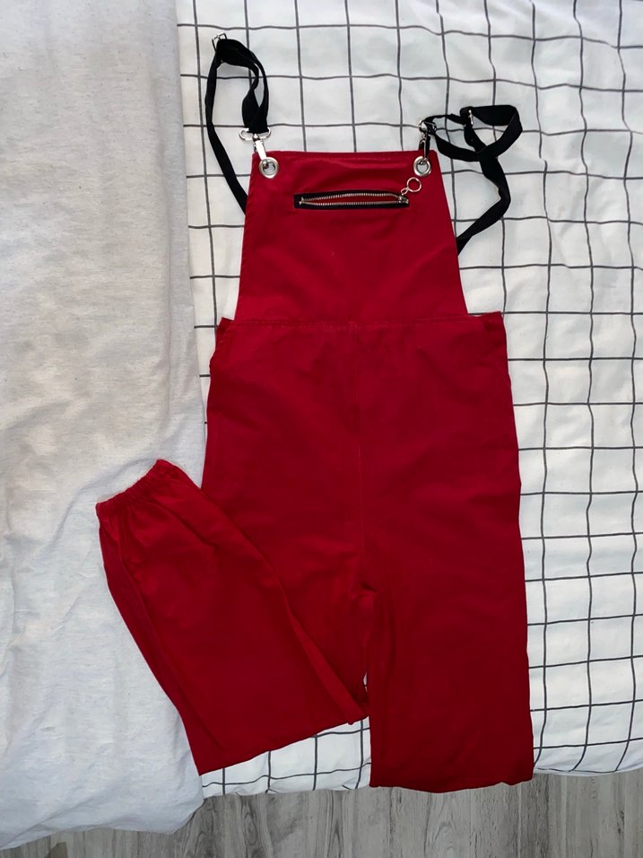Sentetik kumaştan yapılmış, kırmızı renkli, halter yaka askılı, kemerli ve önünde küçük fermuarlı cep bulunan kadın tulum. Canlı renkli sokak stili için uygun.