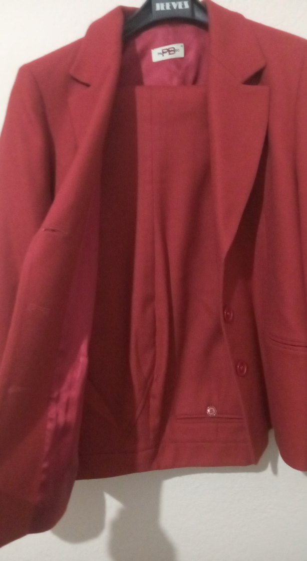 Kadınlar için uzun ceketli, düğmeli, renkli kırmızı düz desenli takım. Ofis için uygun, konvansiyonel kesim ve uzun kolludur. ‍