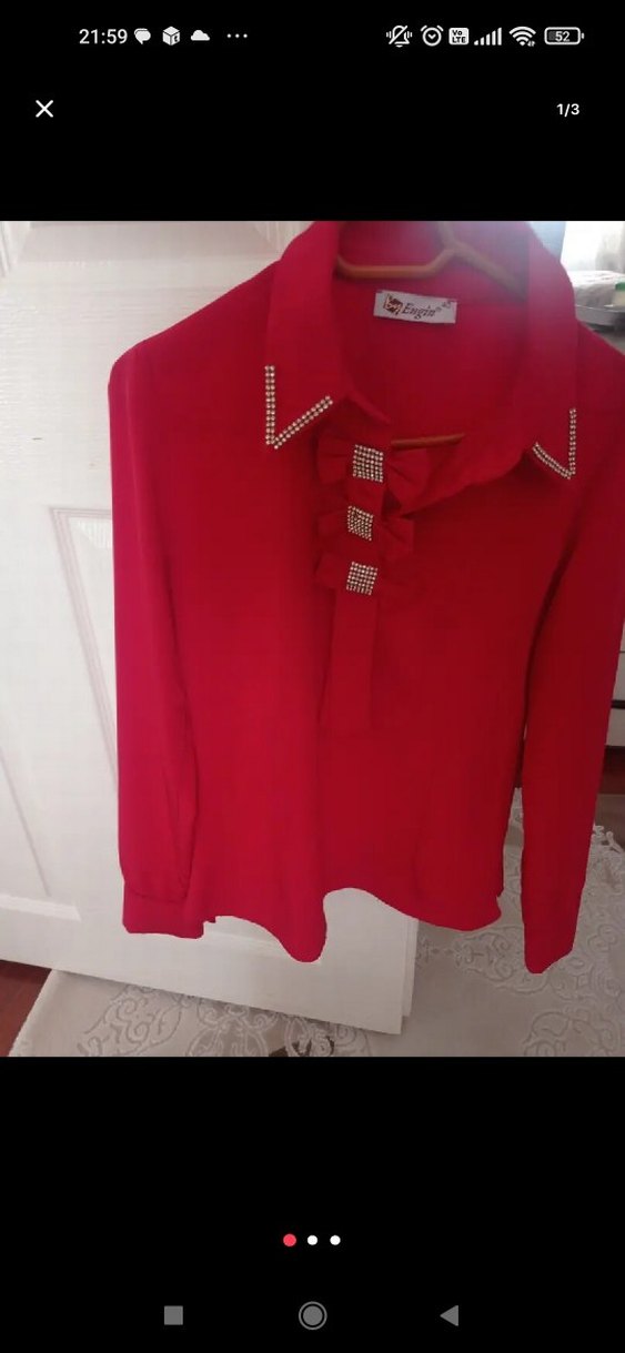 Kırmızı kadın gömlek, uzun kollu ve yakalıdır. Düğmeli ve nakış detaylıdır. Normal boyda, klasik ve parlak sentetik kumaştan yapılmıştır. marka temsili