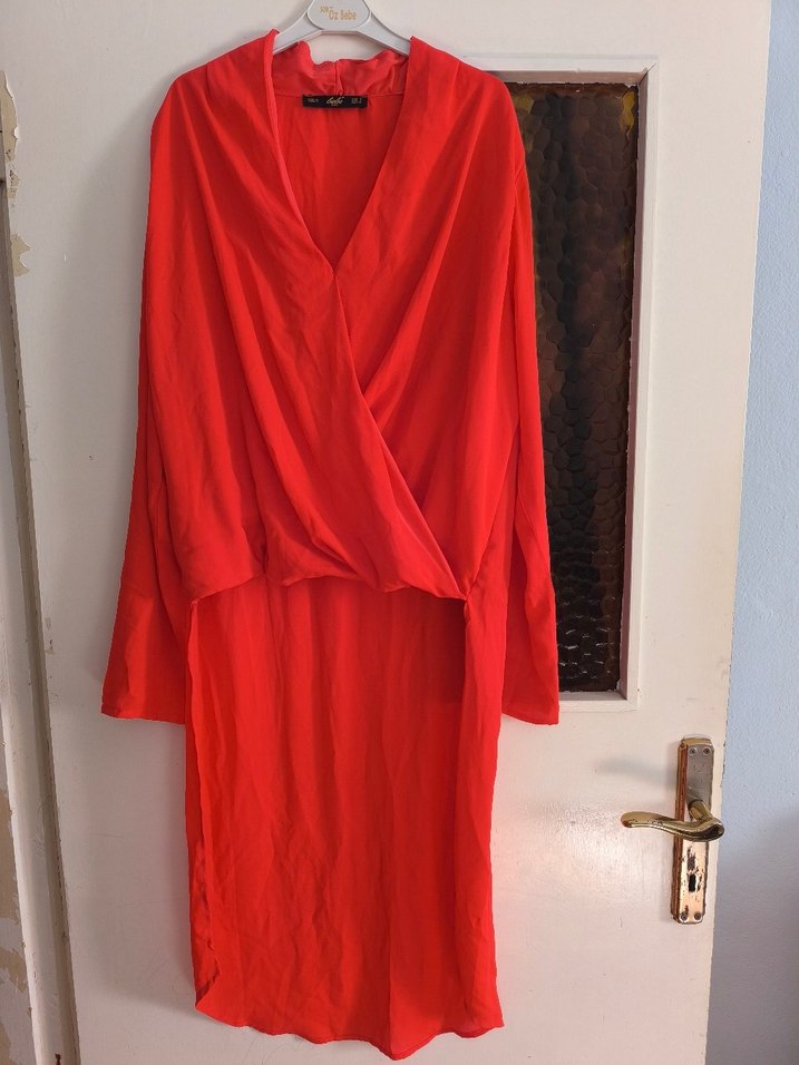 Canlı kırmızı renkte, uzun kollu ve salaş kesim kadın elbisesi. Uzun boyu ve desensiz tasarımıyla çağdaş avant-garde tarzda.