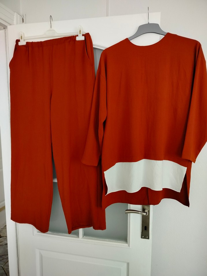 Yumuşak ayrobin kumaştan, uzun kollu, yuvarlak yakalı kiremitı salaş tunik. Minimalist ve şık, günlük kullanım için uygun. temiz sorunsuz ürün pantalon boy 106 cm paça 33 cm tunik boy ön 76 arka 82 iki koltuk aradı mesafe 61 cm ayrobin kumaş