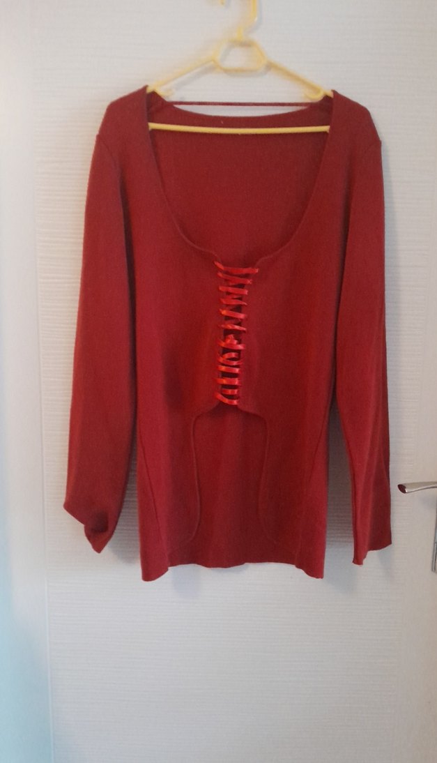 Kırmızı, uzun kollu, dantel detaylı ve dar kesim triko kazak, gündelik kullanım için rahat ve avangart gotik tarz sunar.