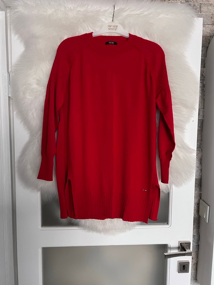 Kırmızı triko kazak, uzun kollu ve yuvarlak yaka tasarıma sahip. Yumuşak ve sıcak kumaştan üretilmiş, günlük kullanıma uygun rahat bir modeldir. Midi boyda ve sade, desensiz yapısıyla dikkat çeker.