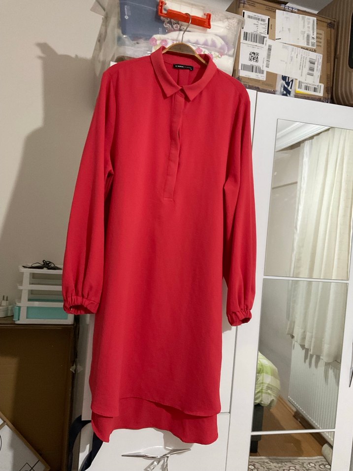 Kırmızı, parlak sentetik kumaştan, uzun kollu, yakalı ve bol kesim midi uzunlukta kadın tunik. Günlük kullanıma uygun, sade ve şık. Boy:104 Bel:105 Kol:62