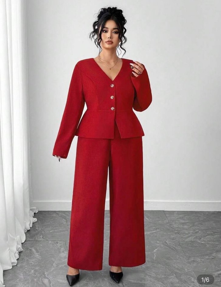 Kırmızı parlak sentetik kumaştan, uzun ve düğmeli, normal kesim kadın takım elbisesi. Ofis için cesur ve normcore tarzda, uzun kolludur. ✨