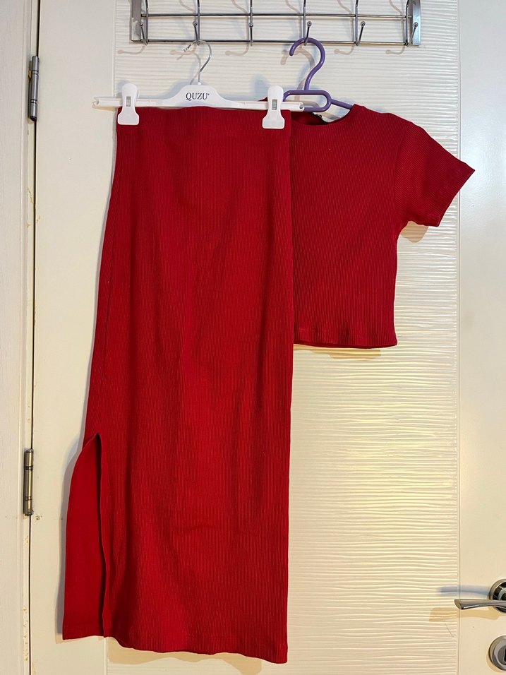 Kırmızı, uzun ve kısa kollu triko crop,uzun triko dar kesim etek. Sokak stili ve günlük kullanım için uygundur. ✨