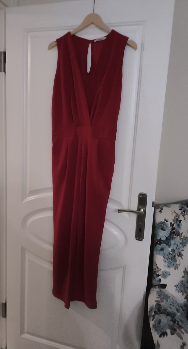 Kırmızı renkte, drapeli tasarımlı, derin V yakalı, kolsuz ve ince kesim kadın tulumu. M beden.