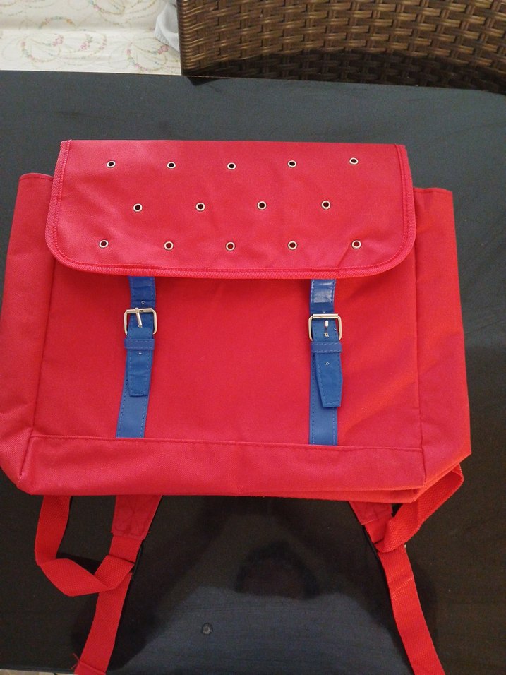 Sentetik kumaştan yapılmış, tokalı kapak ve renkli halkalarla süslenmiş kırmızı kadın sırt çantası. Günlük kullanım için uygundur, minimalist sokak tarzı. Ürün yurtdışından alınmıştır.
