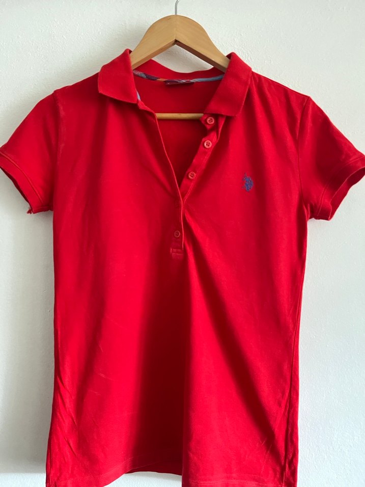 Kısa kollu, yakalı ve düğmeli kırmızı kadın tişörtü. Parlak sentetik kumaştan, rahat kesim ve günlük kullanıma uygun. Merhabaa kirmizi polo tertemizz hiçbir defosu yok. orjinaldir