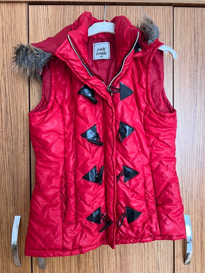 Kırmızı, kürklü detaylı, nakış işlemeli, suni kumaştan yapılmış, kolsuz, normal midi boyda, dar kesim kadın yelek. Rahat sokak tarzı için uygundur. 38-40 uyumludur. Defo olarak arka kısmında hafif cizik vardır. Fiyata yansıtılmıştır.