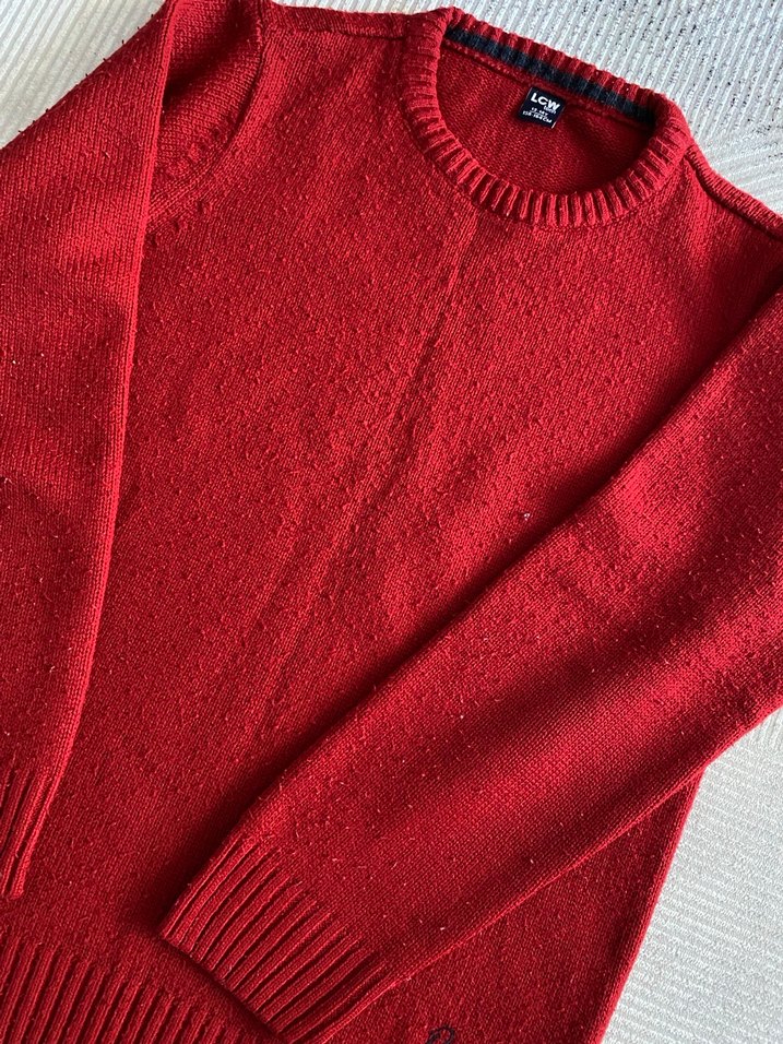 Kırmızı, yuvarlak yaka, uzun kollu, bol kesim kadın yün kazak. Parlak yüzeyli, sade tasarımlı, rahat ve günlük kullanıma uygun.