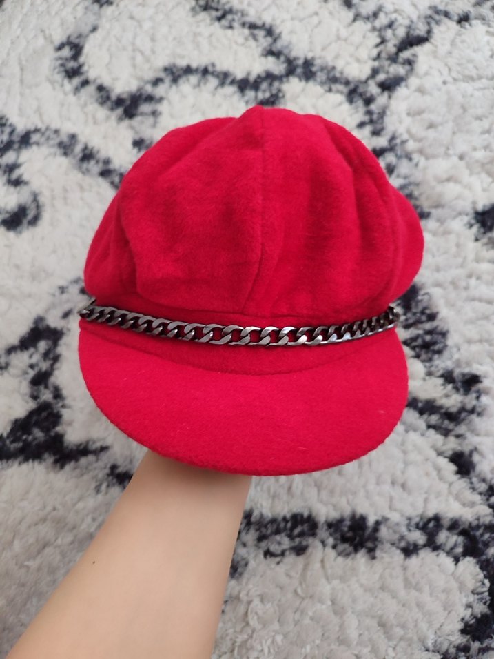 Kırmızı renkte, yumuşak ve sıcak kumaştan yapılmış kadın şapkası. Zincir aksanıyla retro ve bohem tarzı yansıtıyor.