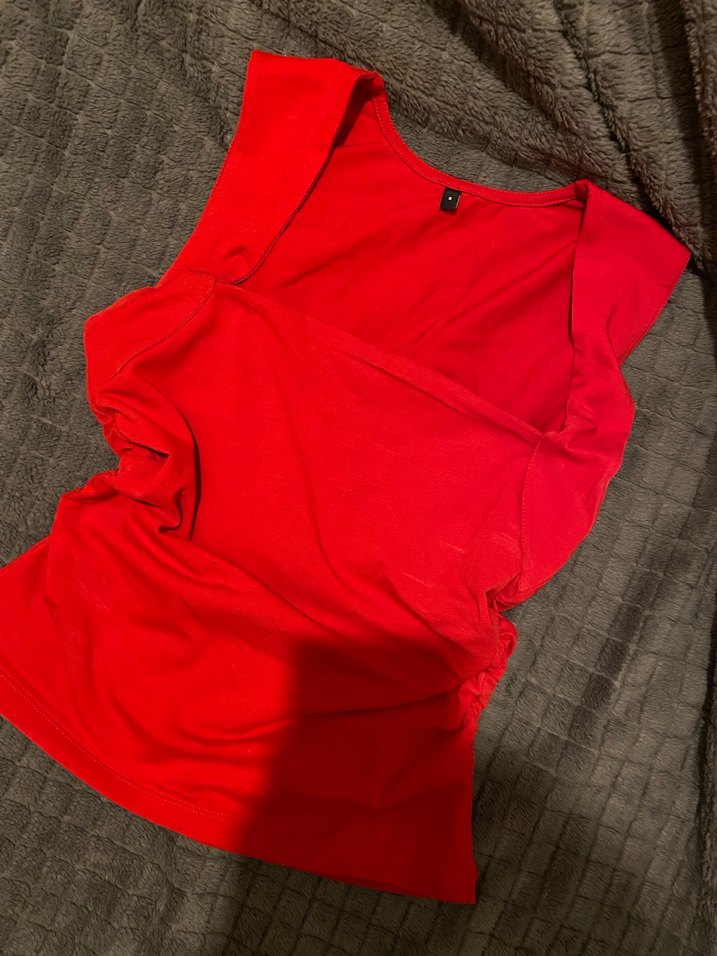 Kırmızı renkli, kare yakalı ve kalın askılı kadın bluz,yumuşak ve sıcak kumaştan, drapeli tasarıma sahip, dış mekan kullanımı için uygundur.
