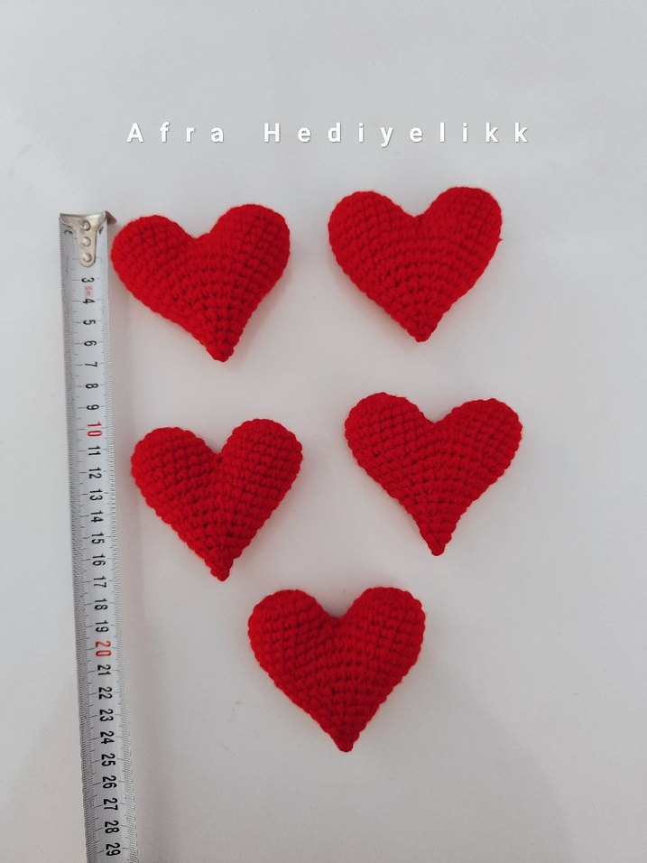 Yaklaşık 7 cm genişliğinde, el yapımı kırmızı örgü kalpler. Hediyelik veya dekorasyon için uygun. ❤️ Adet 50 ₺ istenilen sayıda yapılır Eni 8 cm, boy 7 cm dir. İstediğiniz sayıda almak için ilan açtırabilirsiniz.