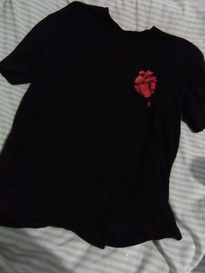 Siyah tişört, kırmızı kalp baskılı, kısa kollu ve yuvarlak yakalıdır. İpek gibi kumaştan üretilmiş, bol kesimdir ve gotik-punk tarzını yansıtır. Romantik akşamlar için uygundur. ❤️ OMUZUNDA NOKTA KADAR DELİK VAR SAĞLAM