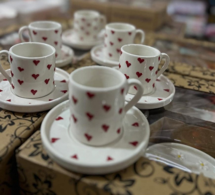 Kırmızı Kalp Desenli Beyaz 6li Fincan Seti