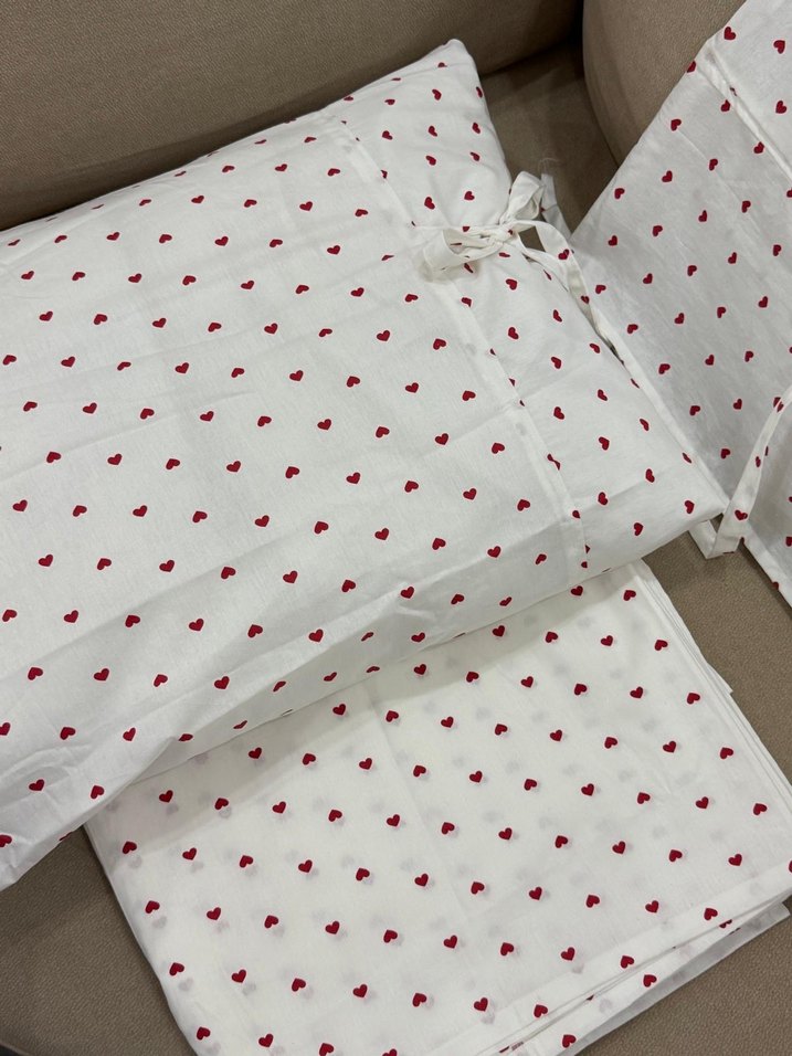 Küçük kırmızı kalplerle desenlenmiş beyaz çarşaf ve yastık kılıfları, yumuşak kumaştan. Bağlama ipleriyle sabitlenir. ❤️ Tek kişilik çarşaf seti 2 adet 50*70 fiyonklu yastık kılıfı 1 adet 170*260 lastiksiz çarşaf Özel dikim