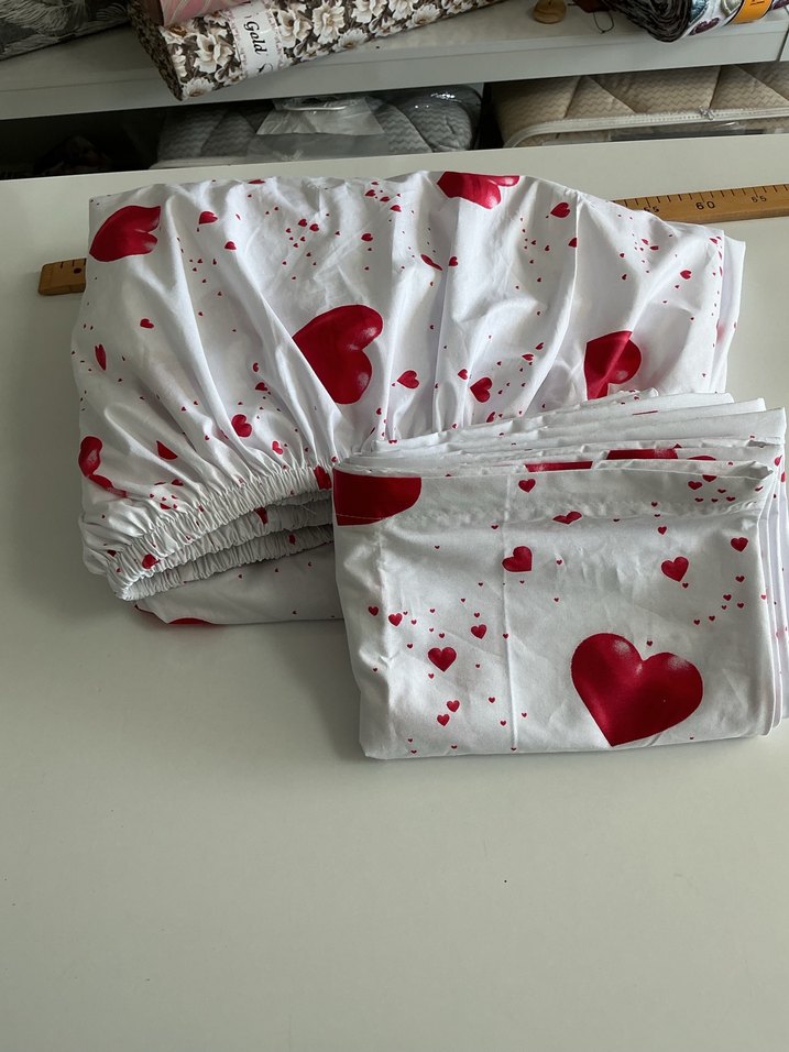 Yumuşak kumaştan, kırmızı kalp desenli beyaz çarşaf ve yastık kılıfları. ❤️ Dilediğiniz ölçüde. Dilediğiniz şekilde dikim yapılabilir. Deco marka %100 pamuk kumaştır. Asla solma yapmaz