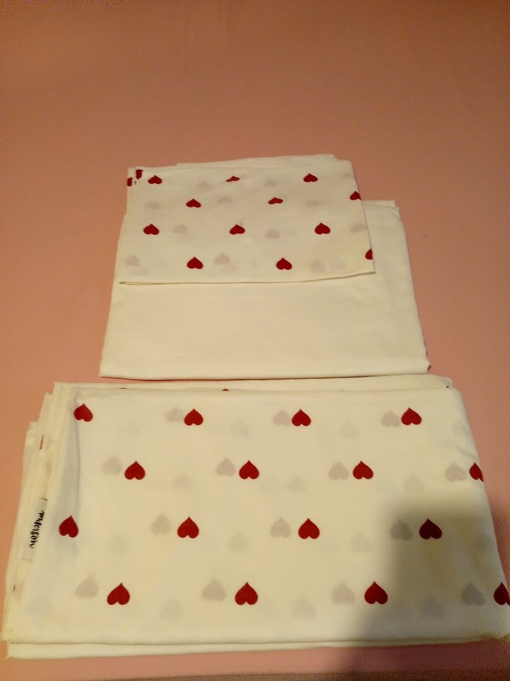 Yumuşak kumaştan, kırmızı ve açık gri kalp desenli beyaz nevresim ve çarşaf takımı. ❤️