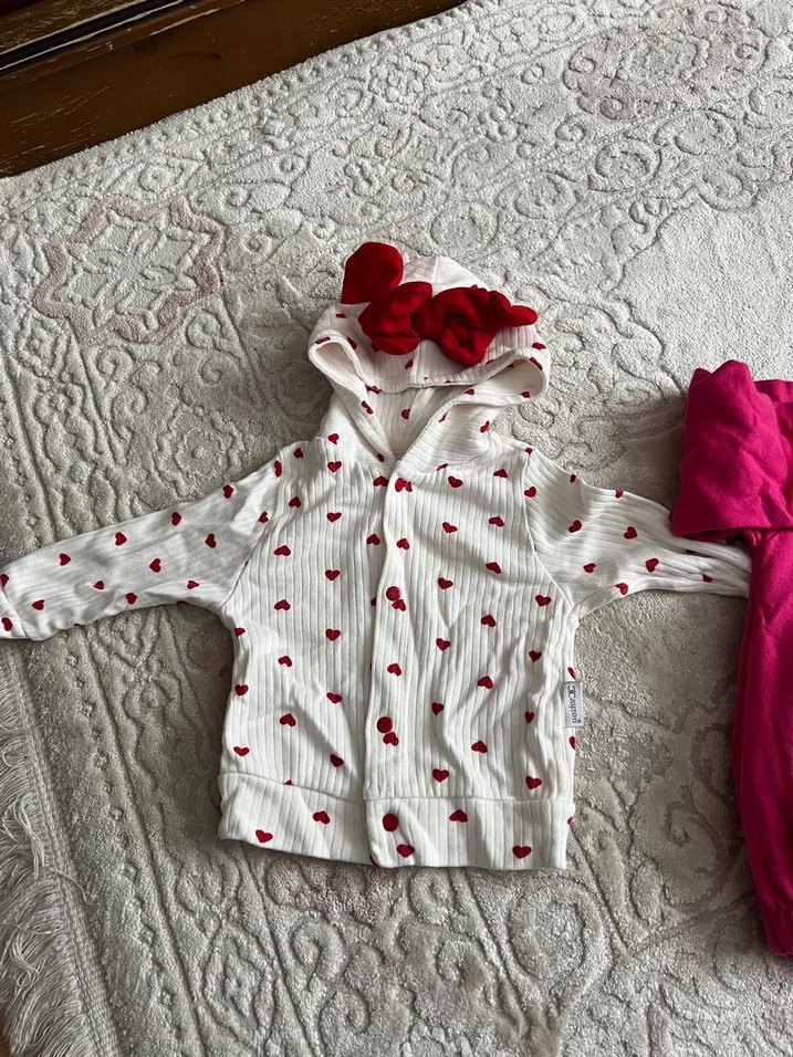 Uzun kollu, beyaz örgü bebek sweatshirtü, kırmızı kalp desenleri ve kapüşonunda kırmızı fiyonk detayları bulunur. Önü fermuarlıdır.