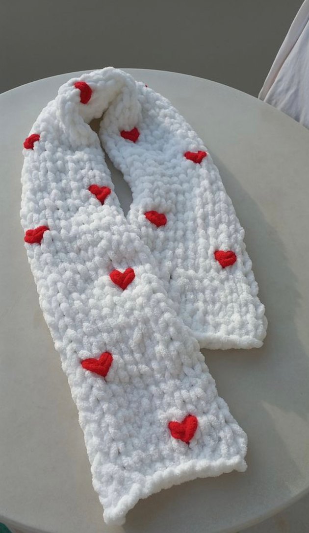 Kırmızı Kalp Desenli Beyaz Örgü Şal