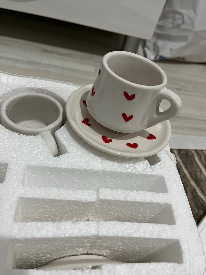 Küçük kırmızı kalplerle süslenmiş beyaz seramik fincan ve tabağı. Hafif ve sade tasarım, kahve veya çay sunumu için uygundur. ☕ FİNCANLAR SIFIR!!! Paketinden açmadım bu köpüklü kutuda keramikadır çok tatlişler bende fazla diye satıyorum kızlar çeyizci kızlarrrr hemen kapmalısınız