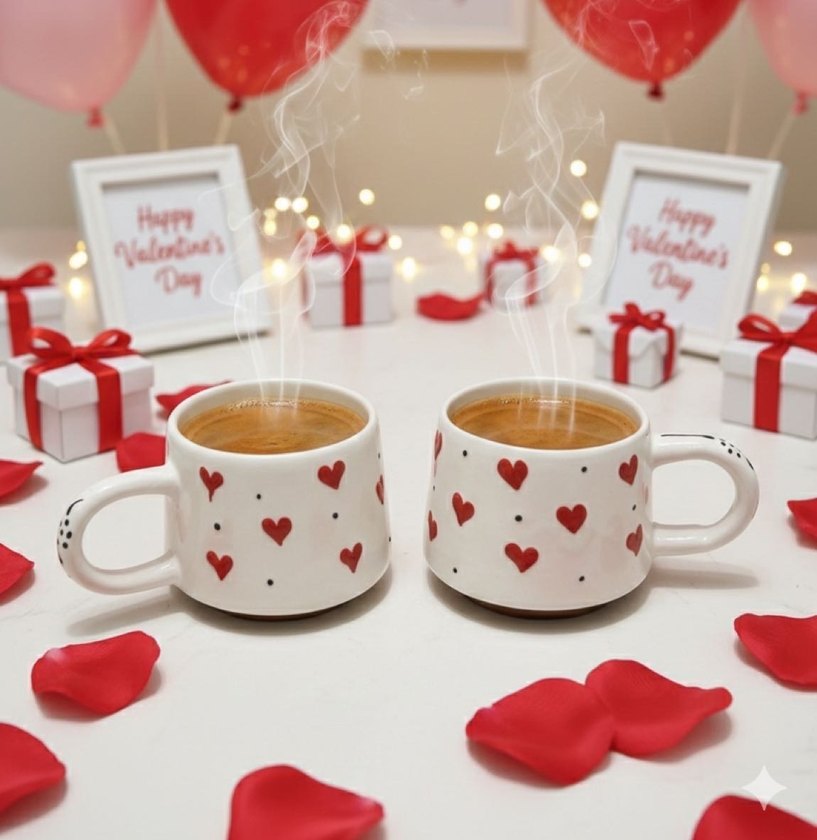 Küçük kırmızı kalplerle süslenmiş beyaz seramik kupalar, sıcak içecekler için uygundur. ☕