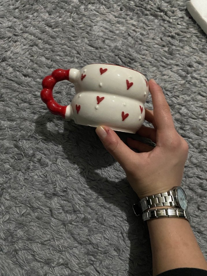 Kırmızı kalp desenli beyaz seramik kupa, kırmızı kulplu ve çift katmanlı tasarıma sahiptir. Sıcak içecekler için uygundur. ☕
