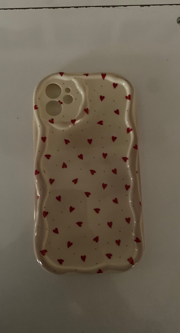 Kırmızı kalp desenli, dalgalı kenarlı beyaz telefon kılıfı. Bohem dantel tarzı detaylar içerir.