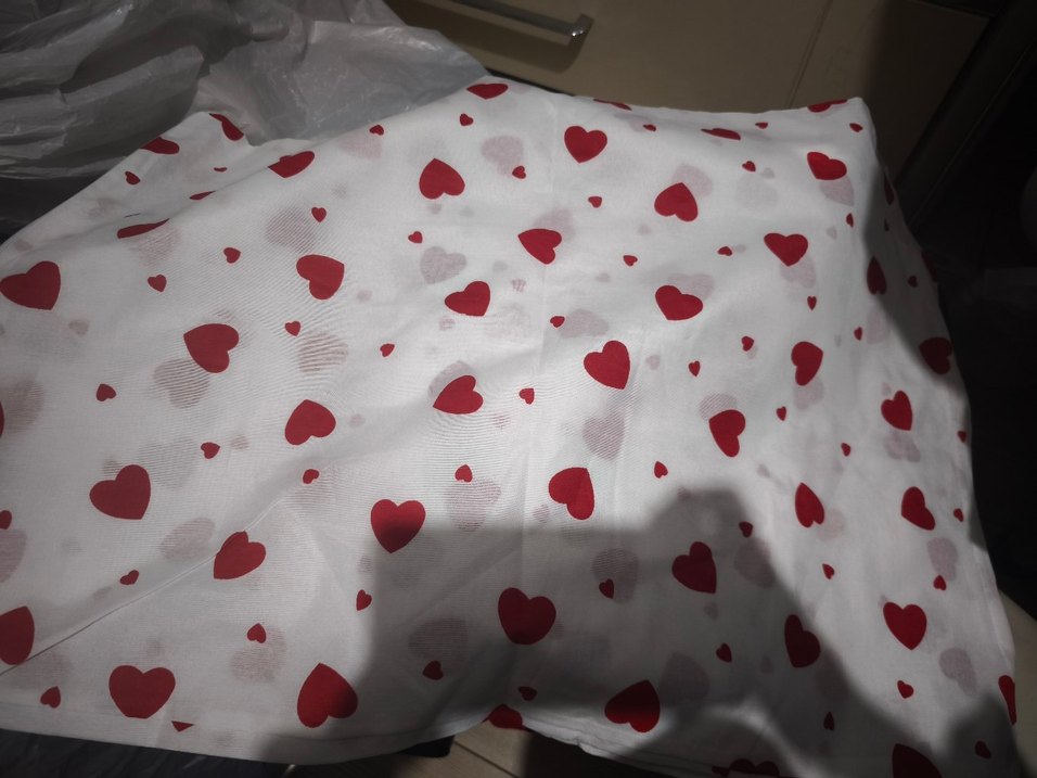 Kırmızı kalp desenleriyle beyaz zemin üzerine basılmış yumuşak ve hafif kumaştan yapılmış . ❤️tanesi 40