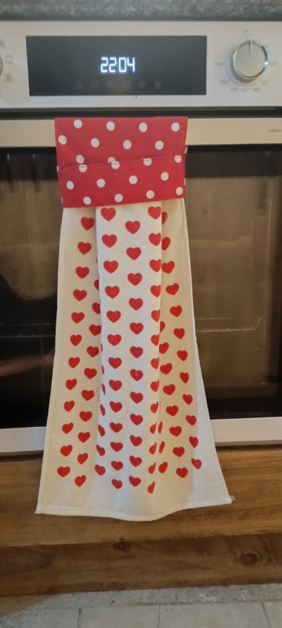 Kırmızı puantiyeli üst kısmı ve beyaz zemin üzerindeki kırmızı kalp desenleriyle renkli ve klasik tarzda mutfak havlusu. ❤️