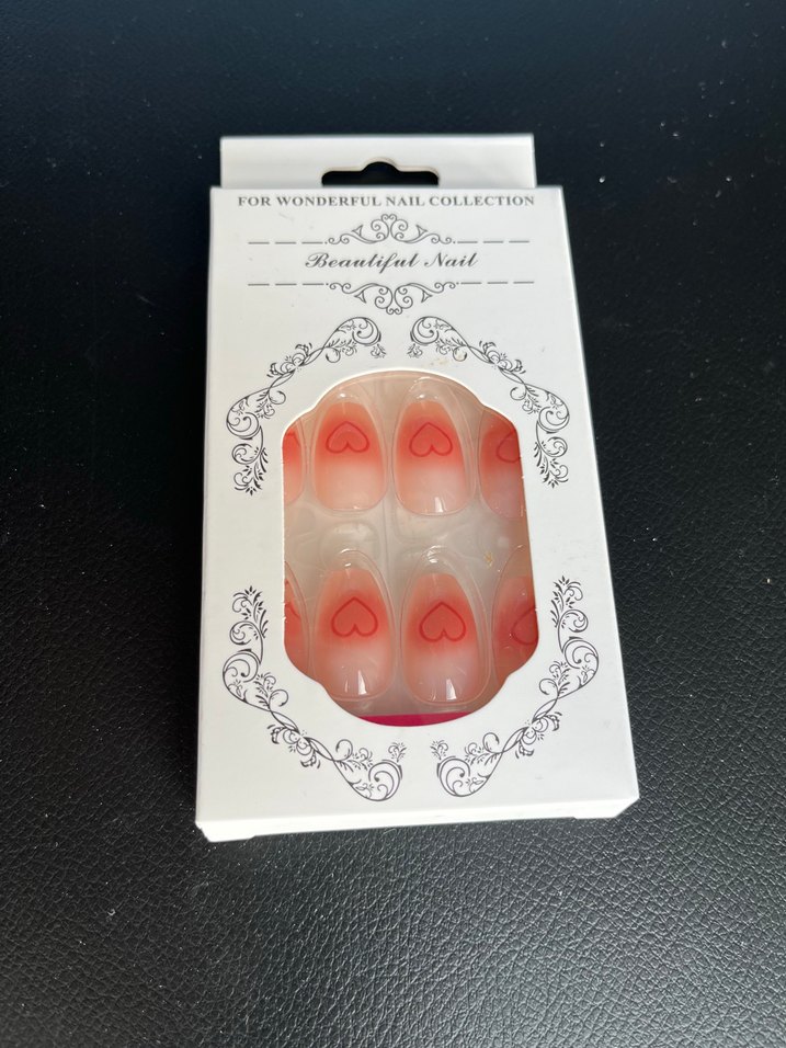 Kırmızı kalp desenli, hafif degrade tonlu takma tırnaklar. For Wonderful Nail Collection ürünüdür. 24 adet tırnak 24 adet yapıştırıcı bir adet Törpü