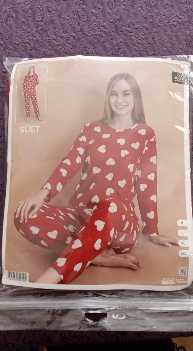 Kırmızı renkte, beyaz kalp desenli uzun kollu, bol kesim kadın pijama takımı. Kısa üst boyu ve rahat sokak stiliyle SUET markalı. ❤️