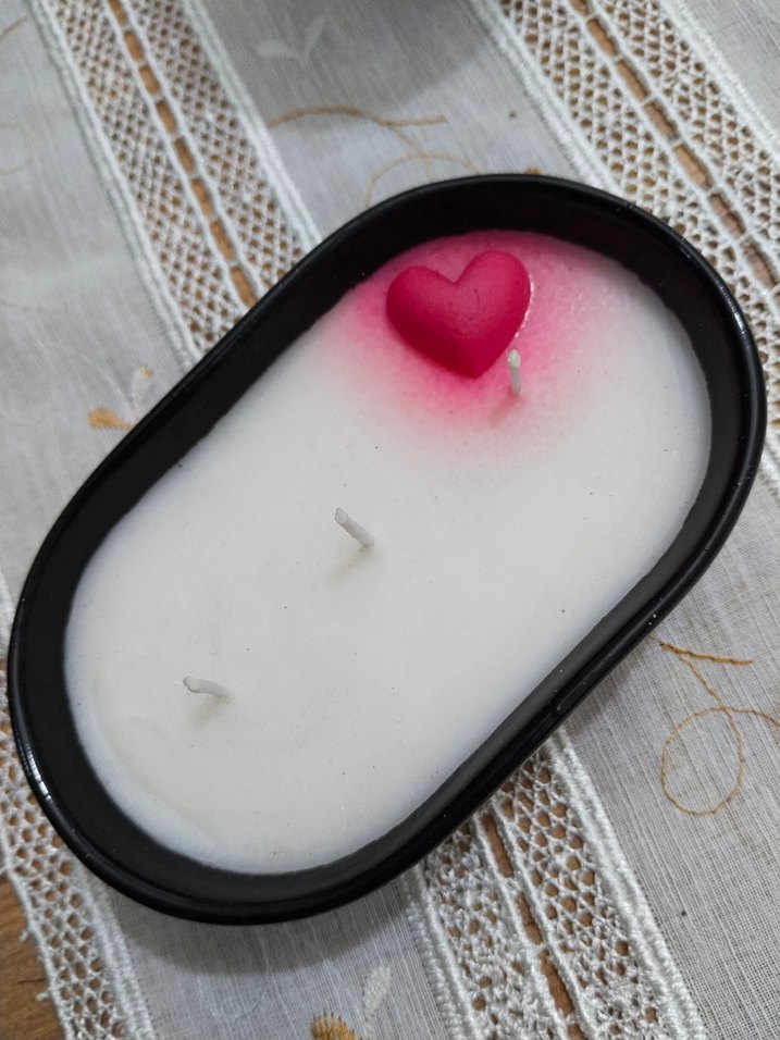 Üç fitilli beyaz mum, üzerinde kırmızı kalp detayı ile siyah oval bir tutucuda sunulmuştur. Sıcak bir ortam için uygundur. ️el yapımıdır