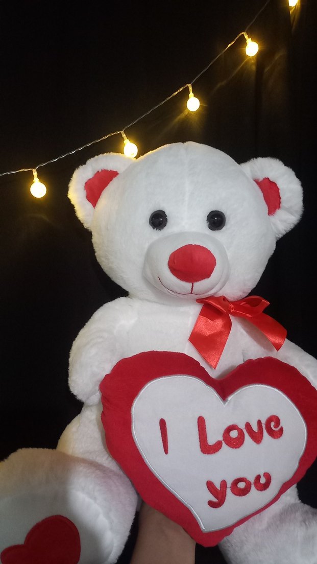Kırmızı burun ve kurdele detaylı, üzerinde "I Love you" yazan kırmızı kalp yastıklı beyaz peluş ayıcık. Yumuşak ve sevgi dolu.