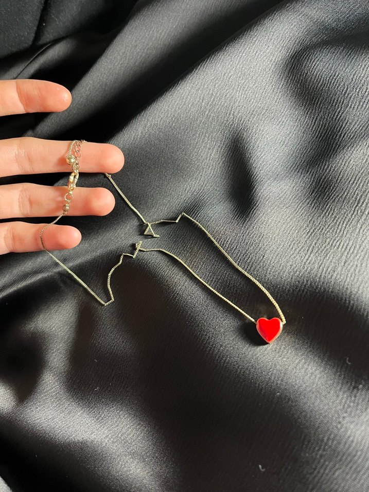 Kırmızı kalp detaylı, zincir tasarımlı midi uzunlukta kolye. Romantik akşamlar için uygun, nakışlı desene sahip.