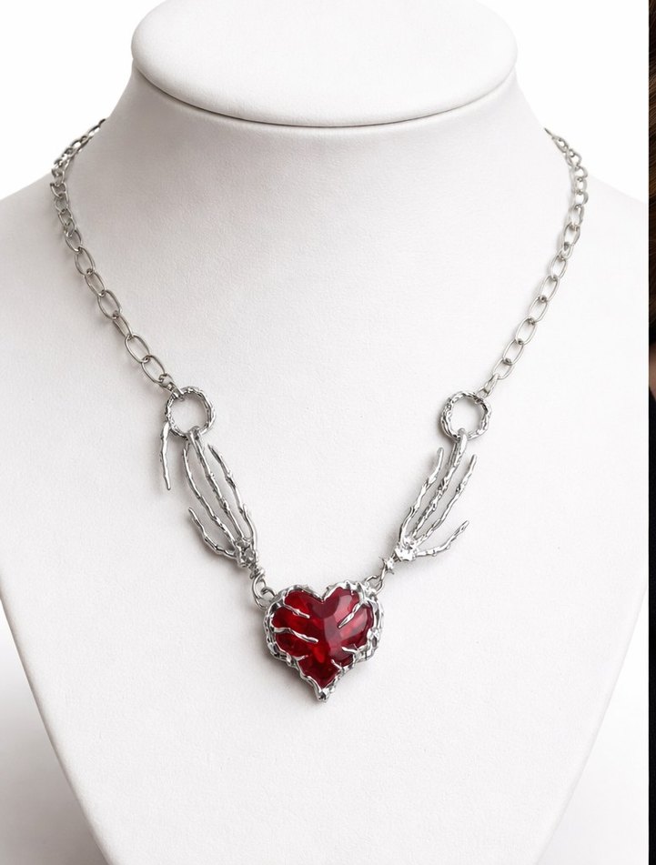 Gümüş zincir ve pençe detaylı kırmızı kalp figürlü kolye, romantik akşamlar için uygun.
