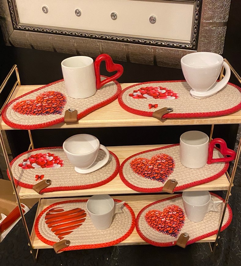 Kırmızı kalp kulplu beyaz kupalar ve uyumlu kırmızı kalp desenli bardak altlıkları. Sıcak içecekler için uygun. ❤️ lütfen fiyat bilgisi alın ilan açtırın