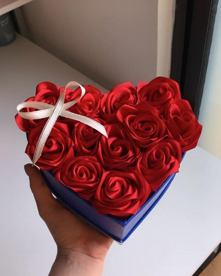 Canlı kırmızı yapay güllerle dolu kalp şeklinde kutu, beyaz kurdele ile süslenmiş. Renkli ve şık bir hediye seçeneği.