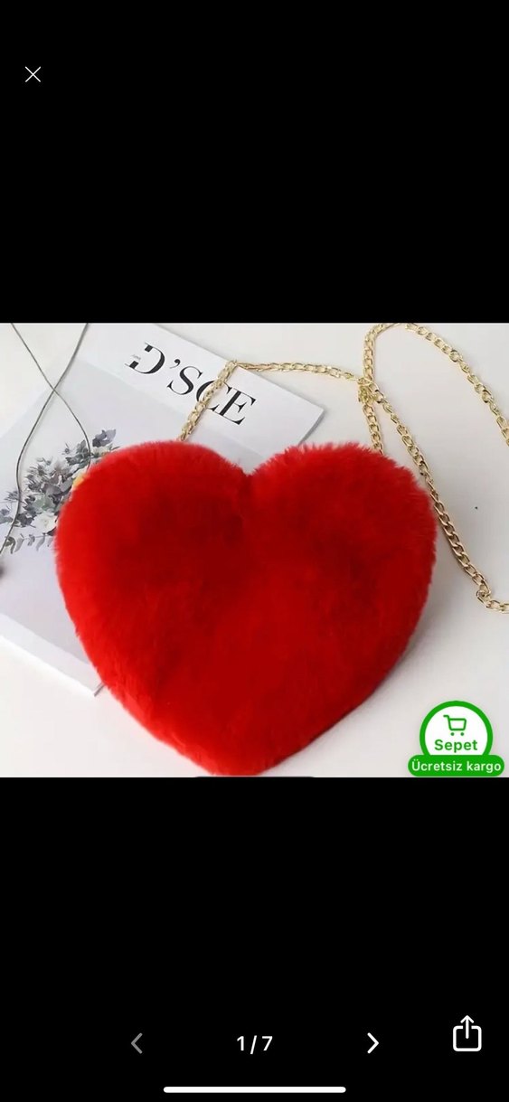 Kırmızı kalp şeklinde, yumuşak ve sıcak kumaşlı, kürk detaylı altın zincir askılı kadın çanta. Marka temsili