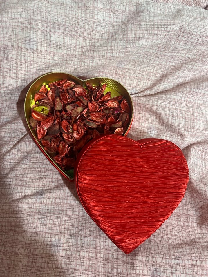 Dokulu kırmızı kalp şeklinde dekoratif kutu, içinde kurutulmuş çiçek yaprakları ile bohem tarzda.