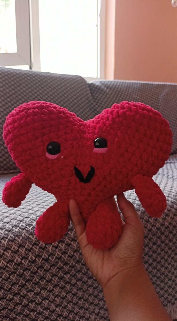 Yumuşak, renkli kumaştan yapılmış kırmızı kalp şekilli peluş oyuncak, güler yüzlü ve sevimli bir arkadaştır. ❤️