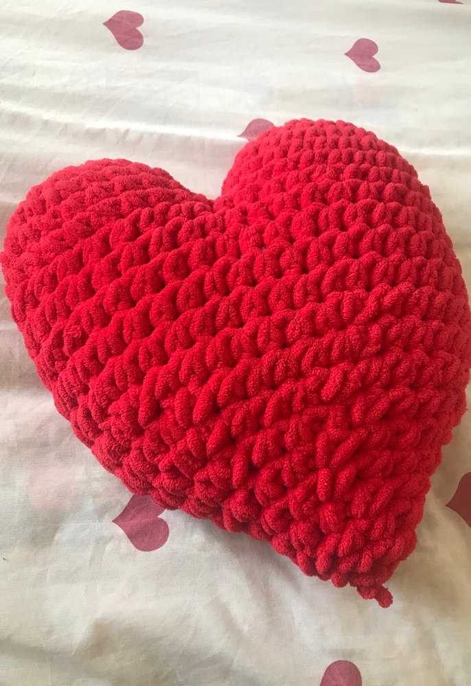 Kırmızı kalp şeklinde, dokulu ve yumuşak yüzeye sahip yastık, ortama sıcaklık katmak için ideal ❤️.