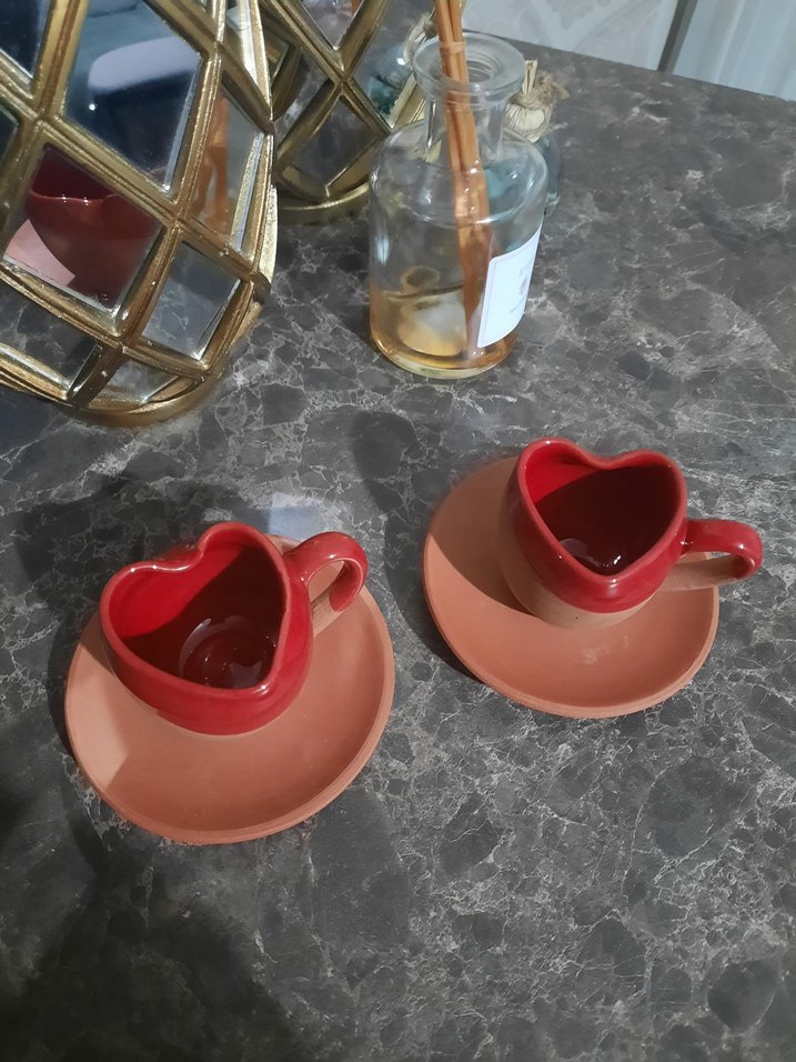 Kırmızı kalp şeklinde iki fincan ve uyumlu tabaklardan oluşan set, renkli bir sunum için uygundur. ☕️