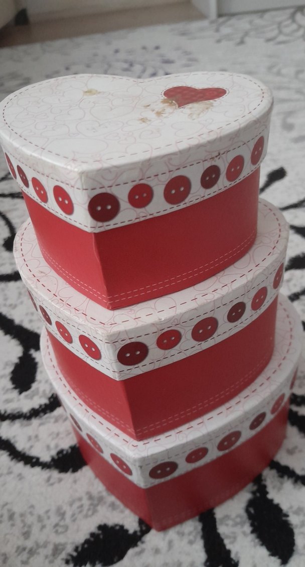 Düğme desenli beyaz kapaklara sahip kırmızı kalp şeklinde hediyelik kutular seti. Renkli hediyeler için uygun.