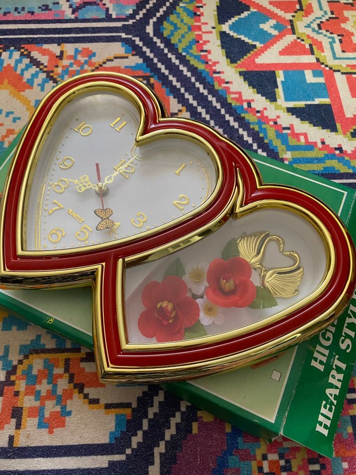Kırmızı kalp şeklinde masa saati, altın rengi detaylar ve içinde çiçek dekoru bulunur. Altın renkte rakamlar ve akreplerle zamanı gösterir. ⏰