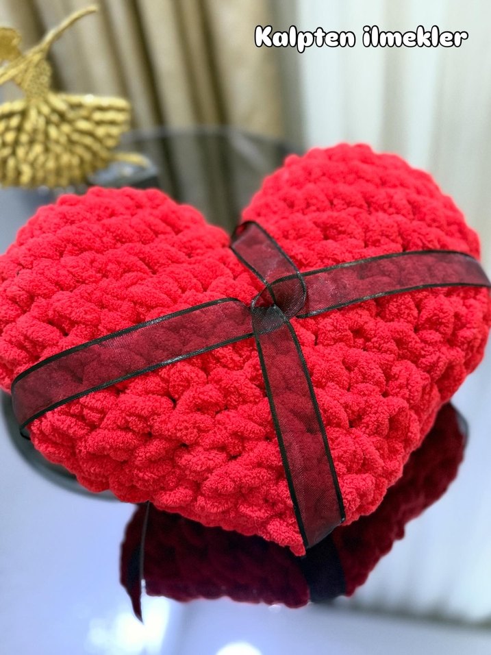 Kırmızı kalp şeklinde, yumuşak dokulu kalp yastık, siyah kurdele ile süslenmiştir
